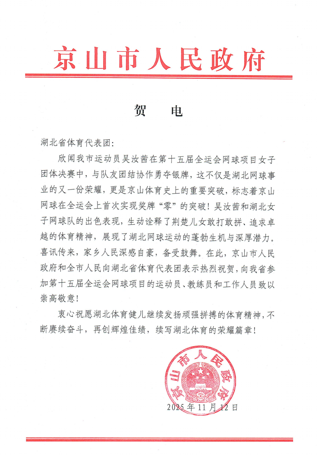 中共京山市委、京山市人民政府在賀電中表示,吳汝茜和湖北女子網(wǎng)球隊的出色表現(xiàn),“標志著京山網(wǎng)球在全運會上首次實現(xiàn)獎牌‘零’的突破”,并寄語她繼續(xù)發(fā)揚拼搏精神,續(xù)寫湖北網(wǎng)球的榮耀篇章。