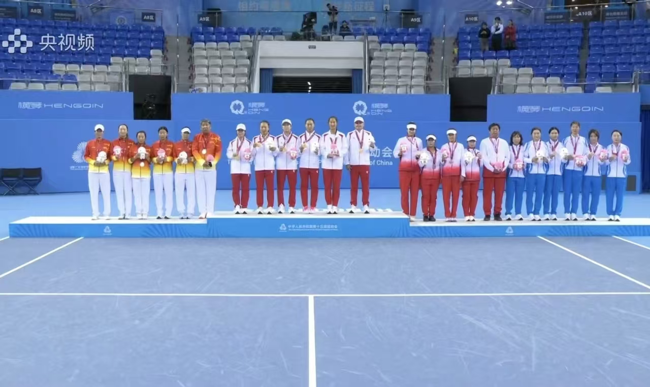 吳汝茜(左一)與隊友及教練在第十五屆運動會網(wǎng)球項目女子團體賽頒獎現(xiàn)場